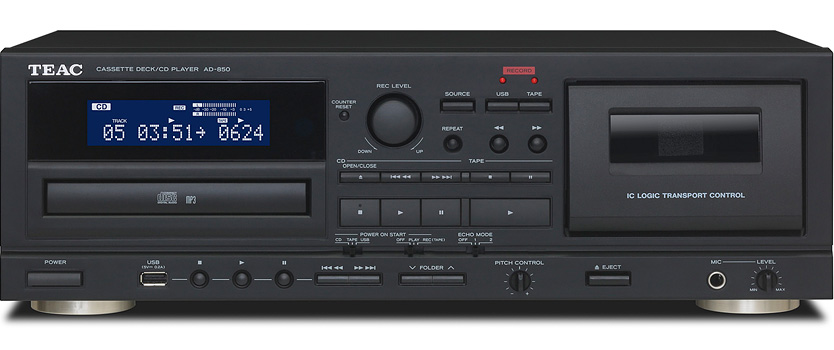 Teac AD-850 to znakomite połączenie magnetofonu kasetowego oraz odtwarzacza CD z obsługą nagrywania na pamięci USB. Wyposażony został także w wejście mikrofonowe z funkcją echa, co można wykorzystać, np. do karaoke.