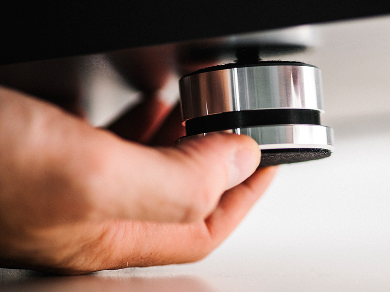 Debut Reference 10 opiera się na trzech regulowanych pod względem wysokości nóżkach z tłumieniem TPE, które tworzą wyjątkowo stabilną i dobrze odizolowaną podstawę. Zastosowanie układu trójpunktowego zamiast czterech nóżek jest rozwiązaniem celowym - zapewnia lepszą stabilność na nierównych powierzchniach i pozwala łatwo oraz precyzyjnie wypoziomować cały gramofon.