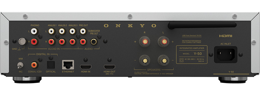 Rozbudowany zestaw złączy obejmuje trzy pary analogowych wejść RCA, wejście Coaxial, przedwzmacniacz gramofonowy (MM/MC), a także wyjście HDMI/HDMI ARC z wejściem HDMI do transferu obrazu i dźwięku np. z gier. Obsługa sieci Ethernet i Wi-Fi umożliwia wysokiej jakości odtwarzanie strumieniowe, a wyjście pre-out subwoofera oraz ulepszone terminale głośnikowe zapewniają pełną swobodę konfiguracji systemu.